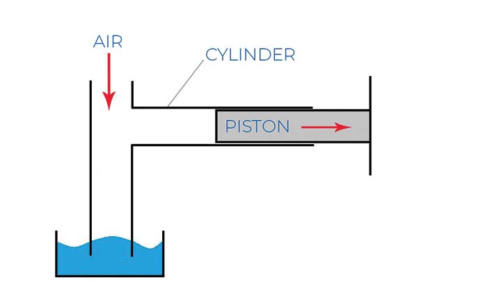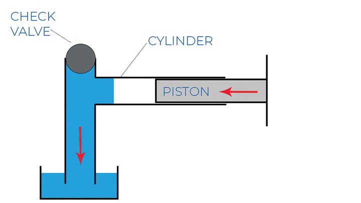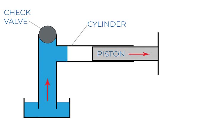以同樣的方式,泵中的隔膜向泵體內和向外移�,與止回閥一起工作以吸入和排出泵中的流體。下面的� 2 顯示,如果沒有止回閥,當活塞向外移動時,空氣會簡單地流入氣缸,從而阻止任何吸��