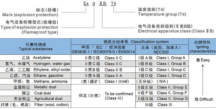 ExdIIBT4適用于II類B級(代表性物質:乙烯),溫度組別為T4及以下組的爆炸性氣體或粉末混合物存在的環境�